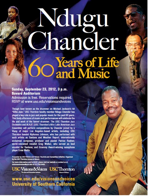 Ndugu(Leon)Chanceler, from his humble beginnings in Los Angeles at Holy Chapel Missionary Baptist Church under Pastor William Cobbs,to, Grammy winning recordings,to being honored at the University of Southern California’s www.usc.edu/visionsandvoices Visions and Voices Humanities & Arts program Sept 23.