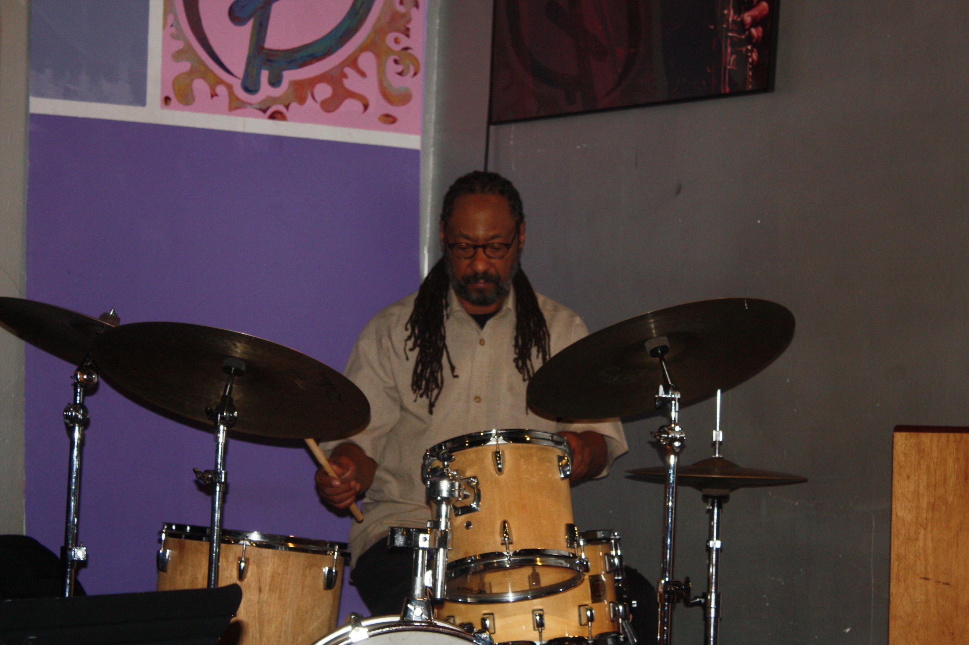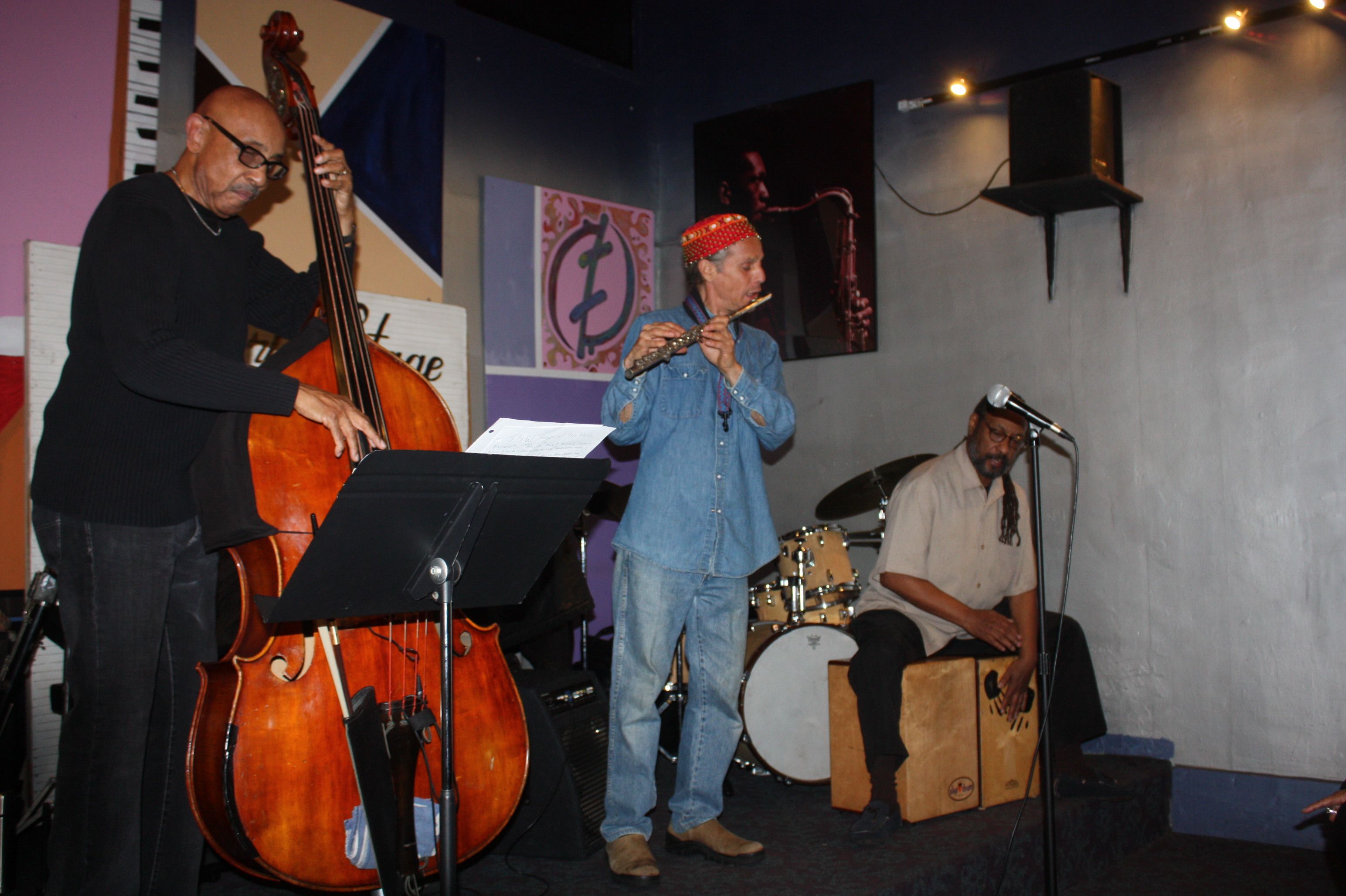 IT never “Rains” in Southern California is not true, its just a matter of what type rain..as I laugh out loud. I went into Leimert Village on Saturday, Feb. 7 to catch a special show at the small, but mighty World Stage in Leimert Park Village. Yes, the same one founded by Billy Higgins and Poet Kamau Daaood over 20 years ago. Tonight , I was invited out by drummer/percussionist Don Littleton who was fronting a TRio of sort “without Piano” just drums/percussions, woodwinds and Bass Violin. what an Order! a quick peek at The personnel told me not to miss it. Though its been over 30 years since I lived in Leimert Park, I still enjoy driving back out from the Inland empire area to “GET MY REAL JAZZ FIX”. DON had assembled an eclectic trio of master Jazz musicians . including Don himself, Bassist John B. Williams, who many of you may remember in the early days at the Lighthouse Jazz Club with The Horace Silver Quintet, and fans of the Arsenio Hall first show in the 80s. He was Bass player /Poet in the “POSSE” Band led by Michael Wolff. Mentors and teachers like Ron Carter, no wonder John is one the premier bassist on a “first call status.” Muti-Reed man Pablo Calogero was the glue on saturday night as he weaved his way through Jazz Pioneer’s compositions without piano, with him carrying the onus of melody and creating new melodies off the harmonics of the original. MONK, DUKE ELLINGTON, Coltrane, just to name a few. The “Entree” was the mastery of improv. One of the tunes that stood out for me was a “call and response” ditty by Ellington re-spunned by the Trio.